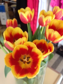 Nu har vi precis hängt upp vårens nyheter från Olars Ulla i butiken på Tullen. Härliga färger och sköna material. När plaggen var färdigstrukna och upphängda var jag bara tvungen att köpa en bukett tulpaner att ställa på disken. Äntligen är det vår i butiken!