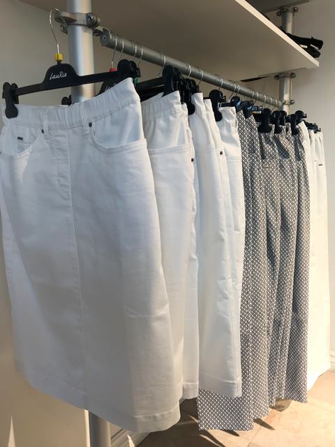 Det är en vit kjol, en vit lång byxa och en lite kortare svart och vit mönstrad jaquardvävd byxa. Allt är i en skön och stretchig bomullsblandning, bara att dra på. Välkommen in för en närmare titt!