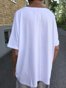 Materialet är 95% viskostrikå och 5% elastan vilket ger ett lite tyngre fall än tex. bomullstrikå. Finns i storlek S-XL. Gudrun tittade förbi och provade genast! Det blev en riktigt skön och sval outfit tillsammans med våra egenproducerade linnebyxor som också finns i butiken i flera färger.
