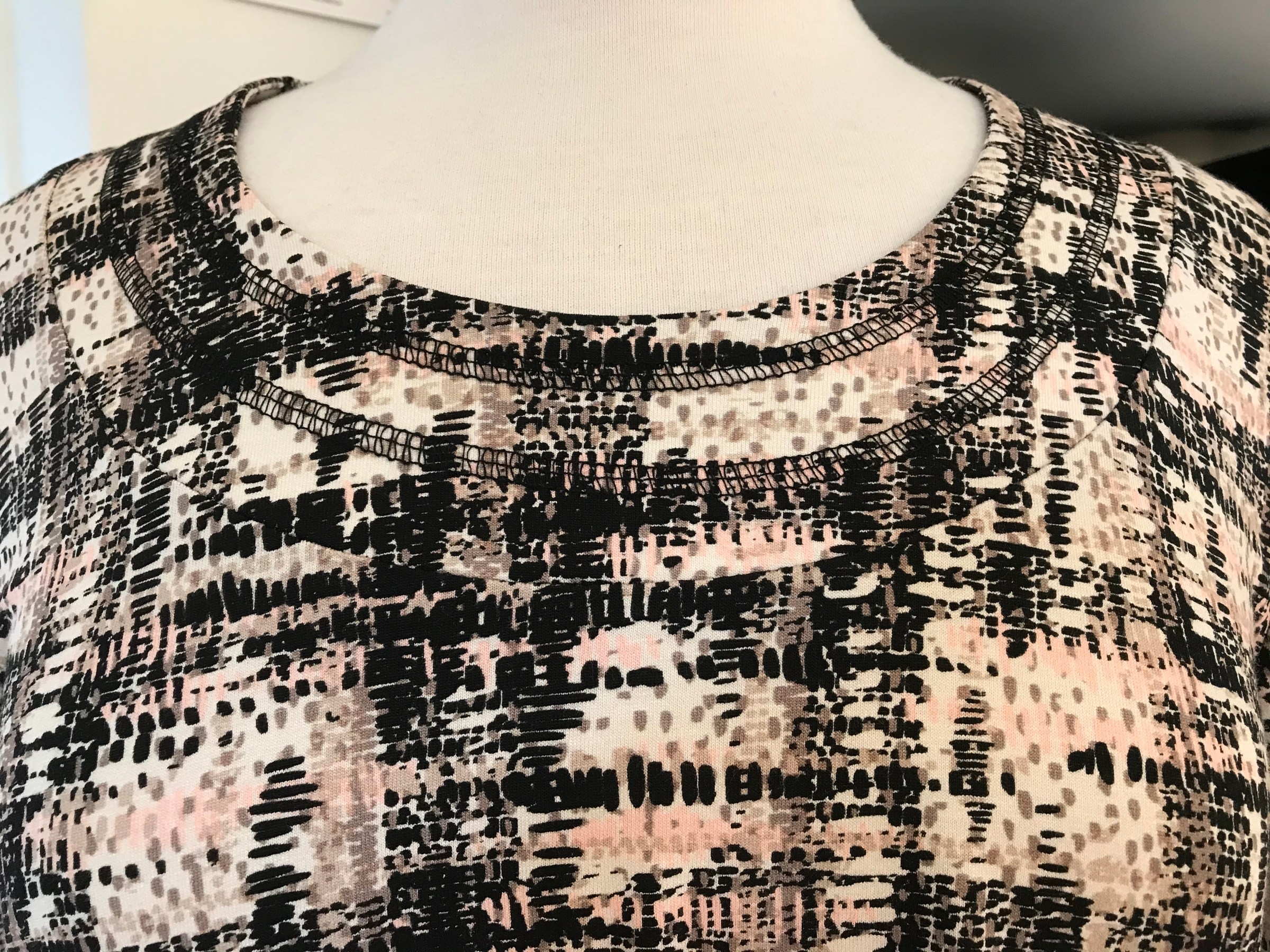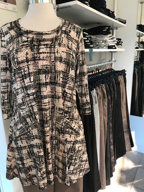 Kanok är ett danskt märke som vi bestämt oss för att prova i butiken. De tillverkar sköna plagg i viskostrikå och har även större storlekar. Vi har tagit in några tunikor och blusar till att börja med. Det mönstrade tyget matchar LauRies nougatfärgade byxor riktigt bra!