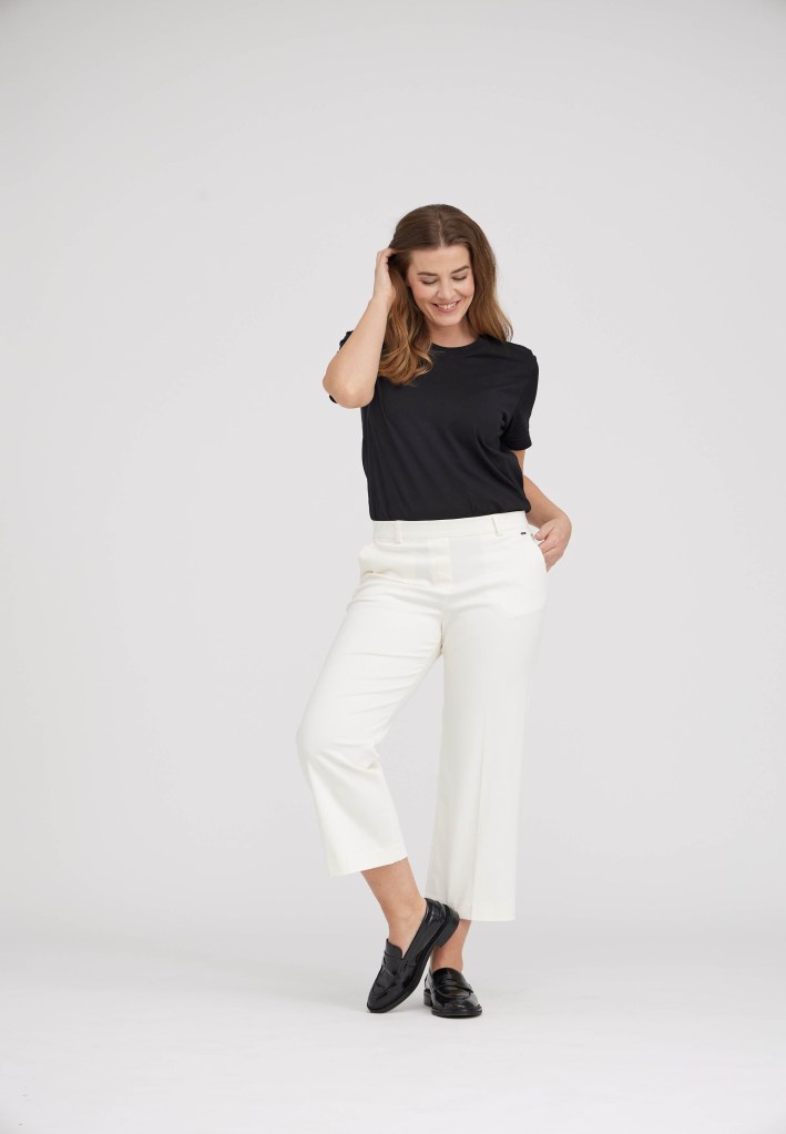 I den tunna sköna viskosblandningen som kom förra våren har vi fått in två olika modeller, Tyler och Donna. Tyler är ”regular fit” i 7/8-längd och finns i färgerna camel och grey sand. Donna är ”loose fit” i 7/8-längd och finns i svart. Phoebe är en vit byxa i lite kraftigare stretchtyg, även den i ”loose fit” och 7/8-längd. Vi har också en ljus hellång byxa, klassikern Kelly i bomullsblandning, ”regular fit” i färgen grey sand.