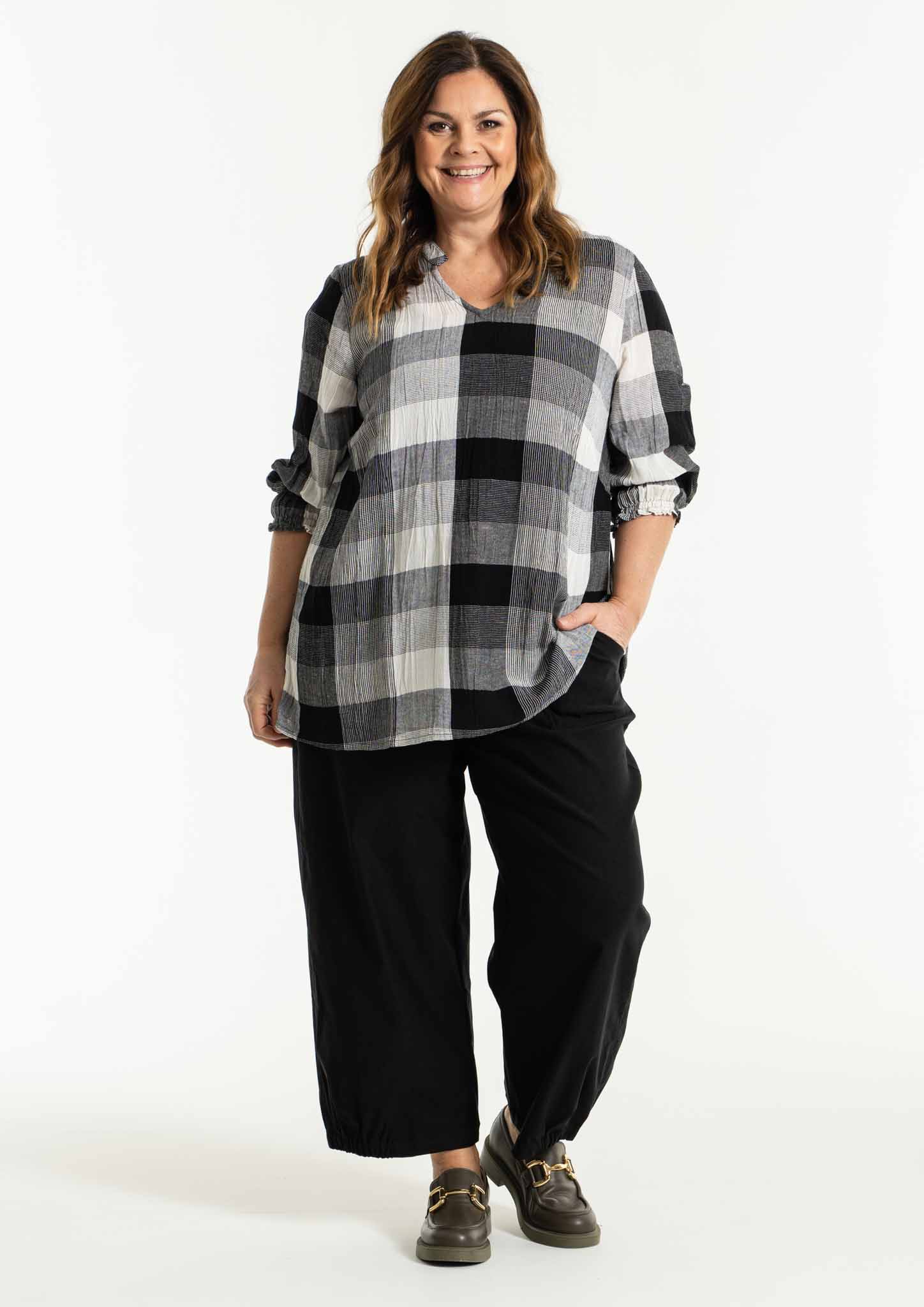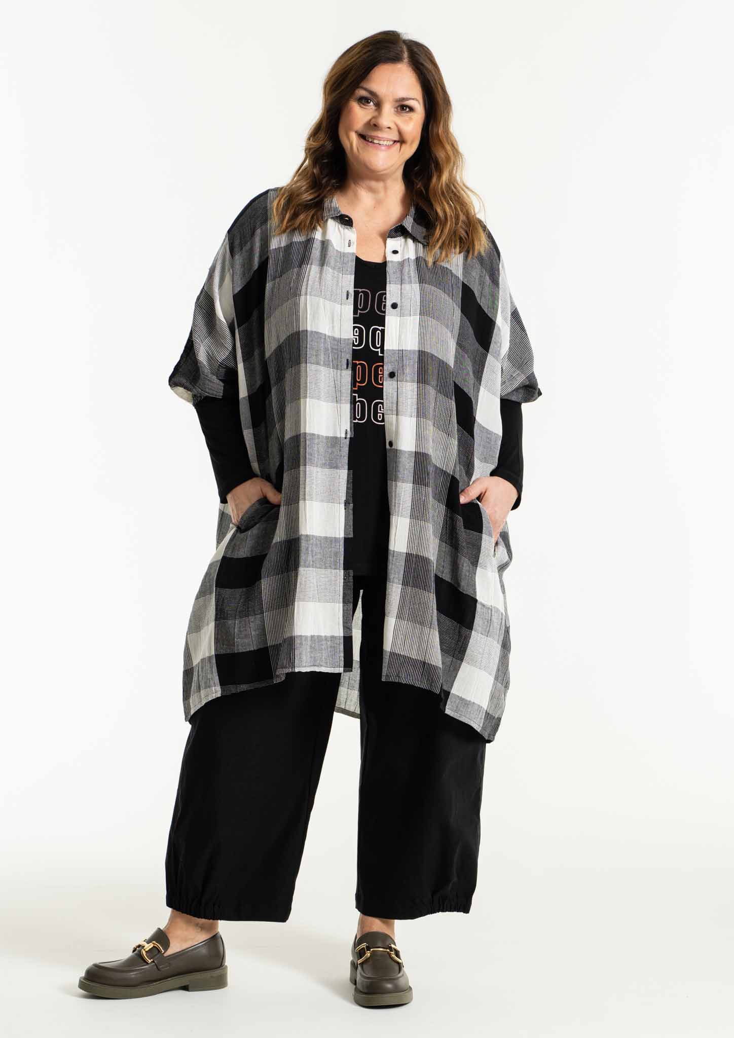En kortare A-formad blus och en härlig längre storskjorta. Materialet är 60% bomull och 40% viskos, en skön krinklad kvalitet, perfekt om man inte älskar att stryka!