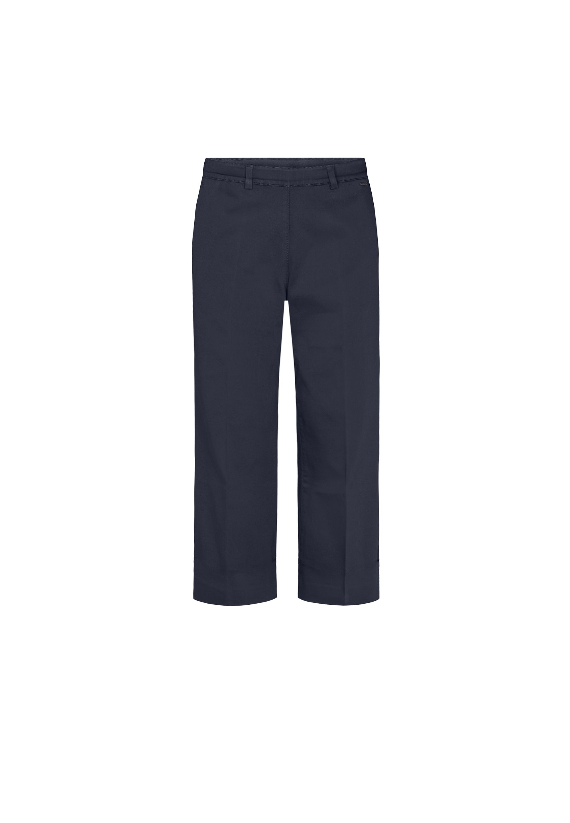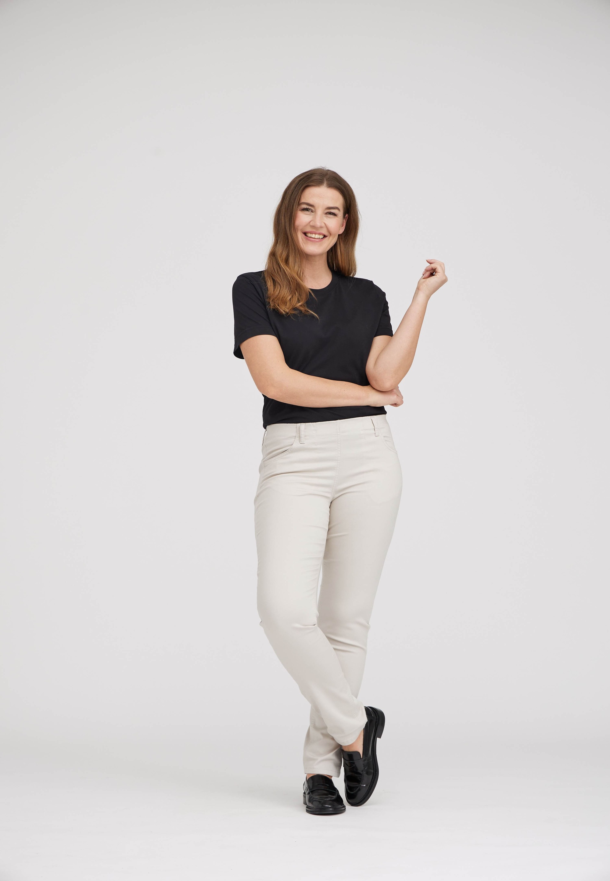 Modellerna heter Phoebe och Kelly. Phoebe har raka lite vidare ben i 7/8-längd och finns i färgerna Ivory och Navy. Kelly har lite smalare hellånga ben (regular fit) och finns i färgen Grey Sand. Båda modellerna är i stretchmaterial, de har fickor fram och resårmidja.